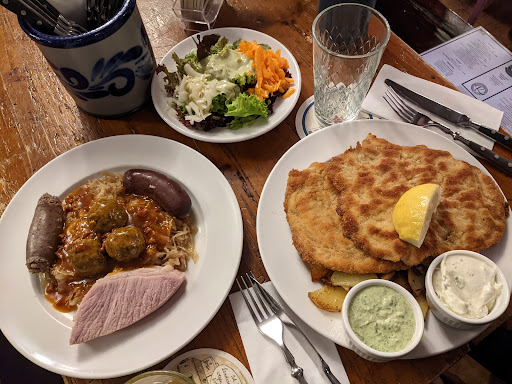 Read moreWe ordered the Frankfurt slaughter plate and the Frankfurt schnitzel. I wasn't a huge fan of either the blood or liver sausages from the slaughter plate, but they were interesting to try. I really liked the schnitzel, it's far superior to any schnitzel I've had before. I thought that their house apple wine was just ok. The tavern style of the restaurant was very cool. There were several long tables and benches inside the restaurant, and different groups of people were seated right beside each other. Everyone was talking and laughing, and it was a great vibe, but this is definitely not the place to come for a quiet, sit-down meal.