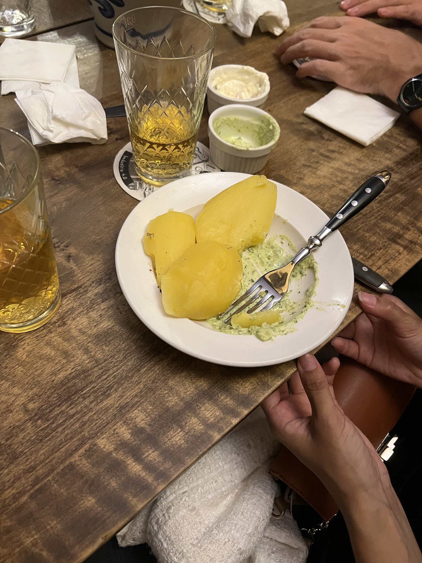 The food. So let's start with the good things. The dessert fried apple rings with cream and ice cream is amazing and there is always space for that. Handkäs and Schneegestöber I can recommend as starter. Sadly the quark was underseasoned, also the schnitzel and tafelspitz. I don't know if it was just salt missing or more but it was a bit bland. The meat was really well done and a bit seasoned It could have been amazing. The green sauce is ok but nothing special.