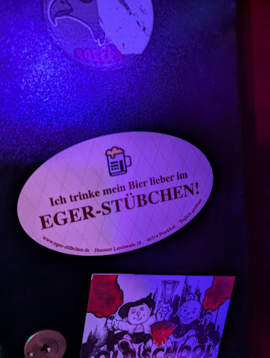 Das Eger-Stübchen ist die beste Kneioe in Frankfurt. Klein, aber nicht zu verwechseln, es ist mega-geil. Tolles Bier zu einem günstigen Preis und tolle Shots, darunter der Mexikaner (wie eine kleine Bloody Mary) für nur 2€! Die Gäste sind offen und freundlich, und gesprächig. Wenn du alleine gehst, wirst du verlassen Sie das Lokal mit mindestens 5 neuen Freunden. Und die Jukebox dort ist unglaublich, mit fast jedem Lied, das man sich vorstellen kann. 10 Lieder für nur 1€! Ich kann es wirklich nicht genug empfehlen. Wenn ihr einen tollen und unvergesslichen Abend in Frankfurt erleben wollt, solltet ihr unbedingt ins Eger-Stübchen gehen! Das Eger-Stübchen hat bis 5/6 Uhr morgens geöffnet, wenn du also nach Mitternacht noch etwas brauchst, bist du hier genau richtig. Kommt rein und genießt es, und grüßt Armand (den...