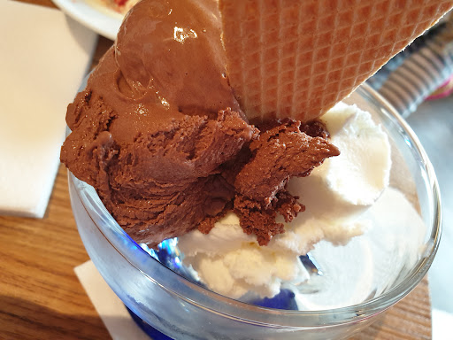 A small shop with bigger seating capacity and lots of options for Ice-creams, and for shakes and snacks too. All Ice cream flavors are very tasty, cakes and Tiramisu are super delicious and fresh. Ice cream shakes were interesting for me. Kids have there own ice-cream menu where they get couple of famous characters made of icecream. One can sit inside or outside. On a sunny day, one can expect a very long waiting time. Even to order there and take away, one have to stand in long queue. But all this waiting is worth. One can also order on phone and pick up the order later. This can avoid waiting in the queue. During winter, they also put up tents and serve hot Wine/Glühwine too. Shop is generally open on everyday from morning till around 20:00. Closing time varies during the winter. Also shop is closed for 2 months (December and January) every year. During Corona time, they also implemented ordering on table using QR code, which they are...
