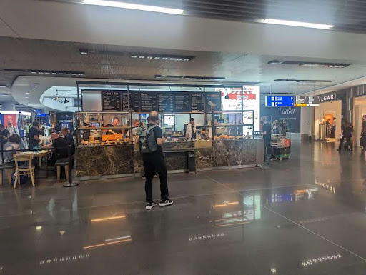 Upon attempting to find a seat, I was shocked when a waiter began shouting at me, insisting that it was a restaurant area, "forbidden" for people who bought at the cash register. Never in my life I thought a waiter could scream at me. People were turning their heads! This was particularly embarrasing also, as there were numerous empty chairs nearby. Despite I was very tired from the flight, (and surely would've bought something else to eat just to sit down) the waiter displayed zero empathy and resorted to aggressive behavior, rudely yelling at me, "leave and go to the gate to eat". Unfortunately, it seems that many other customers have also experienced similar mistreatment.
