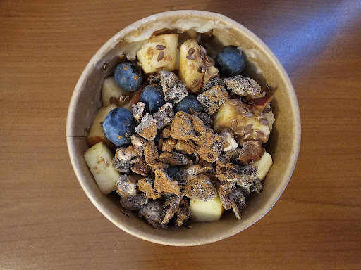 During my visit, I experience good customer service; employees are helpful with navigating Vegan options and kind. What a brunch! The eatery is inside the train station, closer to the trains, to the left from the entrance. I think the prices are really good. The power protein oatmeal is filling and tasty, tastier with the blueberries and cinnamon, to me (mix well before eating). The banana bread is soft, offering a wonderful subtle sweetness. I order a tofu wrap as well (check behind the glass for more Vegan options) though I devour the wrap before taking a photo 😋. The sauce in the wrap really heightens the flavor, with all the ingredients together I feel like I'm eating a Vegan Caesar Salad with Thousand Island Dressing, in a wrap (😅 guess the name of the wrap?). The eatery accepts different...