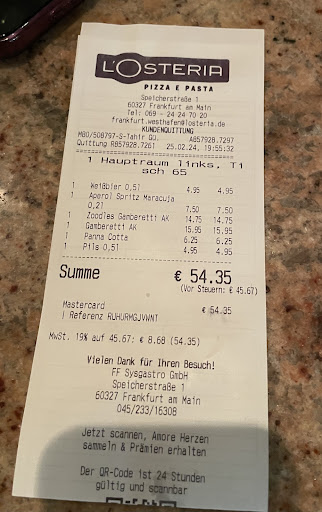 First , the positive: the food is great! Pizza the way they make it in Italy and all the other dishes are to be recommended. The service is very good, considering how full the place always is. Decoration, layout, surroundings, and location are all very pleasant. Prices, for Frankfurt, are acceptable.