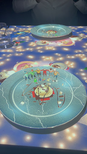 Wir waren am 25.11. in Frankfurt. Meine Frau hatte Geburtstag und so sind wir mit unseren Kinder ( ges. 5 Personen ) nach Frankfurt. Nachdem wir etwas Schwierigkeiten hatten den Weg zu finden sind wir am Empfang sehr nett begrüßt worden. Die Räumlichkeiten waren sehr dunkel gehalten. Mir persönlich war alles viel zu schwarz, aber das ist ja subjektiv. Problem war nur das überall Stolperfallen waren. Man musste bei den Lichtverhältnissen wirklich aufpassen das man nicht fällt. Ein sehr netter Herr brachte uns dann den Cocktail. Da war dann die erste Ernüchterung. Gleicher Cocktail in zwei verschiedenen und auch gebrandeten Gläser ... Fine Dining ?! Naja der Cocktail war lecker. Dann wurden wir mit Verspätung zum Tisch gebracht. Mittlerweile war es 20.45Uhr und wir hatten wirklich Hunger. Doch dann kam die erste Enttäuschung. Wir haben zu fünft zwei Nischen bekommen die gegenüber lagen. Also haben die 3 Kinder in einer gesessen und meine Frau und ich auf der anderen Seite. Diese Information habe ich im nachhinein bei der Auftragsbestätigung gefunden das es sein kann das man nicht zusammen sitzt :-( . Die Bedienung war nett und stets bemüht ... aber ich glaube das war der erste Einsatz. Kommunikation oder ein offenes Auge war Fehlanzeige. Unsere Kinder haben 30 Minuten auf Ihr Getränk gewartet. Apropos Getränke ... diese waren einfach überteuert ! Ein kleines Wasser 4€, ein Wein 10€ aufwärts, usw. Und dann endlich kurz vor dem verhungern die Show startet. Grundsätzlich muss ich klar sagen das die Idee wirklich super ist ! Aber die Durchführung sollte noch einmal überdacht werden. Die Qualität des Filmes auf dem Tisch war schlecht ! Die Figuren waren unscharf und verschwommen. Da ich aus der IT Branche bin habe ich mich etwas umgeschaut. Vielleicht hätte man einfach vom Profit etwas mehr in das Equipment investieren sollen. Die Sequenzen vor jedem Gang war auch wirklich sehr kurz. Man sollte an den Preis von 139€ pro Person denken. da ist ein unscharfes Bild ein NOGO und da sollte auch etwas mehr drin sein. Naja die Hoffnung war das wir wirklich ein TOP essen bekommen. 1 Gang Marinierter Tomatensalat ... der Witz war als ich fast fertig war kam ein Herr der uns noch gefrorenes Öl über die dann nicht mehr vorhandene Tomaten gegeben hat die dann einen Rauch Effekt darstellten. Leider viel zu spät ! Der Gang war lecker, aber viel zu wenig und nichts besonderes. Mittlerweile sind wir nach dem Essen immer zu den Kindern und haben uns die kurzen Sequenzen dort am Tisch angeschaut. 2 Gang Getrüffelte Ravioli ... Mini Portion mit einer Ravioli die viel zu dick war vom Teig und mehr als Aldente ! Die Hoffnung lag auf der Hauptspeise dem 3 Gang ... Steak & Fries . Rinderfilet circa 60 Gramm lauwarm und das Rind ist zweimal gestorben. Absolut durch gebraten, Brokoli eiskalt und die "knusprigen" Kartoffel waren kalt, innen nicht durch und matschig ! Meine Frau und zwei meiner Kids hatten die Vegetarische Variante. Ein kleiner französischer Koch hat ein Asiatisches Essen gekocht was absolut nicht besonderes war. Gibt es kein passendes französisches gutes Gericht ?! Mir würde einiges einfallen ! Das Dessert Japanischer Mont Blanc ... optisch ein Highlight ! Geschmacklich eine extrem süße massive Kugel ... mein Gang und der von 2 Kinder gingen fast komplett zurück. Also Essen ... ganz weit weg von Fine Dining und ganz weit weg von 139€ pro Person. Der Abend hat für 5 Personen 815,50€ gekostet !!! Preis Leistungsverhältnis passt hier leider nicht ! Wenn ich mir das nicht leisten könnte hätte ich es nicht gemacht, ABER für das Geld erwarte ich absolutes TOP Essen mit einer professionellen Bedienung. Ach und bevor ich es vergesse.... nicht nur das Essen war teilweise kalt auch wir haben gefroren ! Es war zwischen dem Essen immer eiskalt. Also ob man eine Tür geöffnet hätte... Ich bin die letzten Tage oft gefragt worden wie es war. Und ich habe jedem gesagt das ich mir schwer tue... Preis Leistung sagt KEINE Empfehlung, die Idee TOP aber leider auch das Essen war sein Geld nicht wert. Also eher keine...