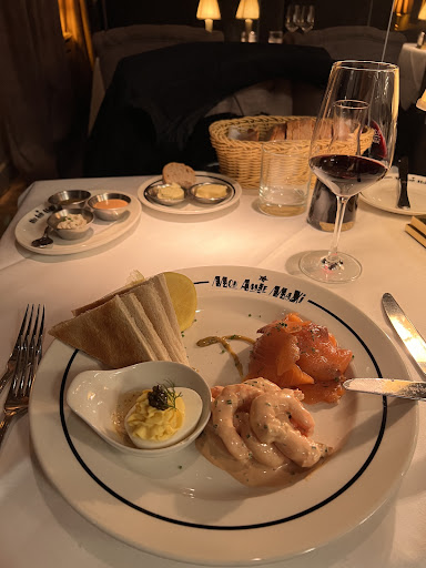 The food was fine, some better, some worse. The appetizer (an egg with caviar, salmon and shrimp cocktail) lacked the flavor and brightness which make appetizers as delightful as they are. My steak (rib-eye) was cooked slightly beyond my ordered medium rare, but still enjoyable and priced fairly, I believe, for what it was.