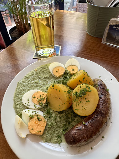 I randomly picked this restaurant for lunch after noticing the nice-looking food on the plates of people sitting outside. The weather was cloudy and a bit chilly that day, so I decided to grab a table inside. It was Saturday around 2 p.m., but the indoor restaurant area was half empty, so I picked a table I liked right next to the window. The waiter brought me a menu right away, but it was only in German. I asked for an English version, but she told me they didn’t have one, which was surprising. Her English was very bad, by the way. I asked her opinion about the most popular and delicious German food on the menu (which, by the way, was pretty big with many options),but she couldn’t understand what I meant and called another waitress to assist. The second lady spoke some English, but she also struggled to explain what I should order. In the end, I took her advice and ordered Green Sauce with Potatoes (Grüne Soße mit Kartoffeln), which she said was a classic Frankfurt specialty, along with a Wild Garlic Bratwurst (Bärlauchbratwurst). The food came out pretty quickly – about 10 minutes. Aesthetically, the plate looked nice and interesting. But not all of the tastes impressed me, unfortunately. The boiled potatoes were soft and pleasant to eat, and I appreciated the hard-boiled egg on the plate, which I always love. But the green sauce didn’t work for me – almost flavorless, with a grassy taste I didn’t like at all. I also hated that the sauce was served very cold. The garlic bratwurst had a decent taste, but it was slightly dry; I wished it had been softer and maybe juicier. For my drink I ordered an apple juice (Apfelsaft), which I really enjoyed. I don’t think I’ve ever had bad apple juice in Germany! :-) Price-wise, the restaurant is on the expensive side. The green sauce with potatoes cost me €14.50, which is way overpriced. The garlic bratwurst was €8.00, which was okay but still a bit more than it should be considering its medium size. And the biggest rip-off was €5.20 for one glass of apple juice! Come on! In total my bill was €27.70, and I found that too high for the overall quality and amount of food I got. From what I remember, most prices on the menu were quite high, so this restaurant is definitely not a cheap option for local German food. This business accepts all major credit cards and Apple Pay (many German restaurants in Frankfurt’s city center do not, asking for cash only, which is shocking). As for the restaurant in general, I liked its classic German vibe and the cozy atmosphere inside. The place looked nice and very clean. I also want to mention that the second waitress came to check on me several times; she was sweet, and I really appreciated that. Would I come back again? Yes, I’d give it another chance, mostly because of the nice vibe of the restaurant. Would I order the same dishes again? No, 100% not; I’d definitely try something else. Can I recommend this restaurant? I’d put it this way – go and check it out, but be careful...