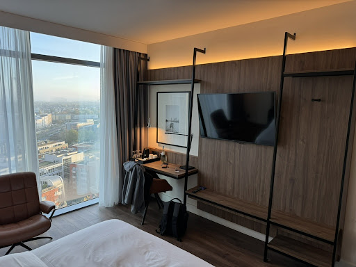 Read moreWe spent a week in Italy for holiday before our stay at Redisson Blu Hotel. This was our last night of holiday so we wanted to celebrate it with a luxurious room and dinner. Parking was easy to find. Know that you need a green environment sticker on your car for Frankfurts environment zone! Also the receptionist was very friendly. I asked through my booking to reserve at the restaurant but this was not arranged. There was plenty of space so we could just sit wherever we wanted. The room was nice and had a great panaroma view. At the restaurant, we were not welcomed by the staff. Know that it was not busy the entire evening. So we placed ourselves on a high table. This was too high for us compared to the chairs so we moved to a lower table. The waiter asked if he could help us and we both told him that we wanted to have dinner. After 7 minutes he brought us a menu. We chose a bottle of pinot grigio. The bottle was presented on a high platform with a wine cooler and ice. There was no pre tasting. We said we still needed a minute to beside what to eat. We closed our menu and after 10 minutes we still hadn’t ordered. The waiter was just chilling at the bar. So I decided to ask for us to order. The waiter then said he thought we only wanted to have drink despite we told him 3 times to have dinner. We were not amused and the waiter was very apathetic. No smile, only a tired face and constantly shuffling on the ground. After we took our order we got a new waitress for the rest of the evening. The bartender. We had the feeling that the original waiter did not want to help us any longer. This was very weird. The girl was nice. Very helpful and kind. After the mains we wanted to have a smoke outside and told this to the male worker. I also told him that we wanted to have another bottle of wine. “To take to the room?” He replied. No, just to drink at our table. We also wanted to have dessert. “You should have told me earlier, because now the kitchen is closed.” I was perplexed. No mention of the kitchen about to close and no final round of drinks. Because when we hadn’t even finished our bottle, the light was already dimmed. The food was great, the menu is not very diverse and the service was lacking. Not at all what you would expect from a 4 star hotel as a worker in hospitality myself. The pool was nice and opens early. You do have to go through the gym with your bath towel… breakfast was also nice. Someone forgot to put the bowls on the buffet. These were added once I asked for it. The staff of the hotel was very friendly. The restaurant should have a look into their staff because this was...