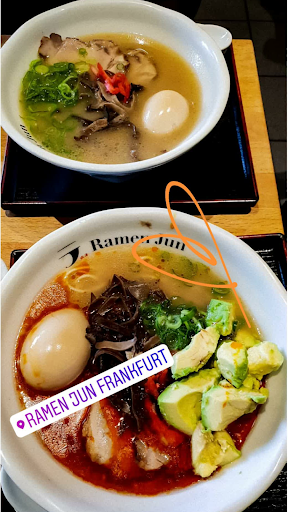 Read morePretty spontaneously went to Ramen Jun for lunch with my sister and I'm glad I didn't decline. The location is less than 7 minutes away from Skyline Plaza in a quiet side street. Red and black are the dominating colours of the decoration but it looks very nice. The seating area is stretched on two floor levels. Service was very friendly and helpful when we were not sure about which Ramen to take. The starters came shortly after we ordered and there was enough time to enjoy them before our main dish came in. I had the Tonkotsu Deluxe (12€) while my sister had the Aka Deluxe with Avocado topping (15,5€). There was a small misunderstanding and they first added Avocado to my Ramen, after I explained that I'm allergic they gave me a whole new bowl (I know because I would have had an reaction from the traces). The broth was A1 and the noodles had the perfect consistency. The Chashu was perfectly sliced and was fitting for small bites. We spent 38€ (+tip/ no drinks). A very pleasant...