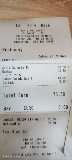 Read moreQueridas camareras, leider habe ich gestern vergessen euch ein Feedback zu unserem Abend zu geben und hole dies nun nach. Uns hat es allen sehr gut geschmeckt und wir sind uns einig bald wieder zu kommen. Leider habe ich den Fehler gemacht die Rabas mit Aioli (super zart) vor dem Lachs- und Thunfischtatar zu essen weshalb ich erst das letzte Drittel so richtig genießen konnte. Daher der Tipp die Gäste darauf aufmerksam zu machen dieses Gericht vor allen anderen Speisen zu essen da sonst nicht das volle Aroma ankommt. Und nun noch etwas an die Adresse der Nörgler die hier in den Rezensionen unterwegs sind. Wenn man schon einmal in einer Tapasbar im „echten“ Spanien war weiß man das zur Authentizität all das gehört was man im Tabla Rasa findet eben auch das man die Bedienung nicht schüchtern und dezent heranwinkt ohne einen Ton von sich zu geben und das die Leute sich laut unterhalten. Und heißt es nicht immer es sei ein gutes Zeichen wenn auch Landsleute das Lokal besuchen? Nun am Nebentisch kam kurz nach uns eine Gruppe von 8-10 Leuten aus Spanien und Südamerika an. Wer fine dinning erwartet ist hier allerdings an der falschen Adresse, die spanische Küche ist oft einfach aber fast immer lecker. Was nun Preise und Portionsgrößen angeht so muss der Koch genauso wie wir die Zutaten in Deutschland einkaufen und ist wie wir ein Opfer der Inflation. Die Portionsgrößen finde ich erstens gar nicht so klein und eine Tapa ist eben keine Vorspeise so wie in Deutschland üblich außerdem ist bei einigen Tapas eine nicht gerade kleine Salatbeilage mit einem leckeren Dressing dabei. Das Schöne dabei ist das man sich so kreuz und quer durch die Karte futtern kann. Eine ganz kleinen Kritikpunkt habe ich doch noch, es wäre schön wenn das erste Körbchen Brot pro Tisch gratis wäre aber erst auf Bestellung bereit gestellt wird. So vermeidet man die Verschwendung von Essen und macht die Gäste trotzdem glücklich. Meine Preiseinschätzung pro Person ist nicht zuletzt deshalb höher als bei anderen weil wir zu viert neben den insgesamt 10 Speisen auch reichlich guten Wein gebechert haben. Meine neuen Lieblingsspeisen im Tabla Rasa sind neben dem Lachs- und Thunfischtatar von der Tageskarte die Empanadillas mit Fleischfüllung und natürlich die Rabas :-) Zu guter Letzt, wir haben keinen Absacker bekommen obwohl wir wie ich glaube angehnehme Gäste waren. Aber wer das unbedingt braucht soll halt zum...