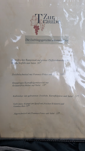 Read moreAm Sonntag besuchten wir das Restraunt, zur Traube das Lokal ist sehr schön eingerichtet und strahlt viele positive Farben, aus. Wir wurden sehr nett empfangen es waren nicht so viele Gäste da, das änderte sich aber schlagartig mit der Zeit. Die Karte bietet von Vorspeisen bis hin zu argentischen Rumsteak und andere leckere Sachen. Wir bestellten einmal Bandnudeln mit geschnezlten mit Souce und Pilzen mit Salat und bei mir gab es Schnitzel. Der Salat kam prompt das Dressing war genau richtig nicht zu sauer nicht zu süß genau richtig typische Öl Essig Dressing und dazu gab es wirklich leckeres knupsriges Brot. Die Hauptspeisen sahen auch sehr lecker aus und auch die Bandnudeln und alles super toll zubereitet. Bei mir waren es 2 Schnitzel und Pommes und das tolle war schön knusprig außen und innen sehr zart. Bemerkenswert das die Schnitzel sehr dünn waren und sehr an das Wiener Schnitzel heran kam. Alles in allem einfach nur Top immer wider gerne und kommen...