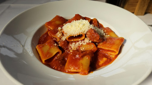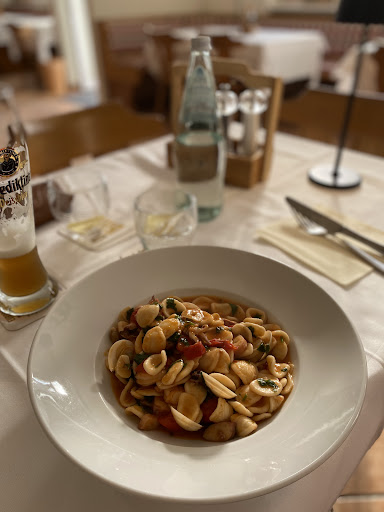 Die Speisen waren zwar qualitativ hochwertig und abwechslungsreich (nicht die üblichen Spaghetti Carbonara oder Bolognese), aber mit einigen Schwächen. Beispiel: Die Orecchiette mit Tomatensoße, Salsiccia und Rucola, Parmesan. Tomatensoße war sehr, sehr Salz arm und etwas säurig. Kompensiert aber mit frischen, süßen Datteltomaten. Die Salsiccia war ohne Röstaromen und fast roh. Ich kenne dieses Gericht mit scharf angebratener Salsiccia mit einem ordentlichen Schuss Rotwein, die dann entweder in den Teller mit Nudeln hinzugegeben wird. Oder die gekochten Nudeln mit Tomatensoße werden zum Schluss in die Pfanne mit Salsiccia gegeben und kurz geschwenkt. So aber hat die Salsiccia wie gekocht geschmeckt. Außerdem habe ich den Rucola roh auf den Nudeln als Garnitur erwartet. Sie wurden aber wohl in der Tomatensoße gekocht und waren somit labbrig und haben viel vom intensiven Geschmack verloren. Der Parmesan hat sich als ein Löffel geriebener Parmesankäse herausgestellt, der lieblos auf den Nudeln auf 2 cm Umkreis regelrecht geworfen wurde. Hier habe ich kleine Parmesanstücke (Scaglie) erwartet. Auf Anfrage gab es immerhin eine volle Dose geriebener Parmesankäse auf den Tisch. Am meisten enttäuscht war ich allerdings vom selbstgemachten Tiramisu. Er hatte optisch und geschmacklich nichts mit Tiramisu nach original italienischem Rezept zu tun. Die Löffelbiskuits waren gestapelt wie offene Holzbalken, wie man bei Holzhäusern sieht. Und dazwischen war keine Mascarpone-Creme, sondern einfach nur Schlagsahne mit Amaretto Geschmack und Kakaopulver. Für 6,90 € kann man ein echtes Tiramisu erwarten.