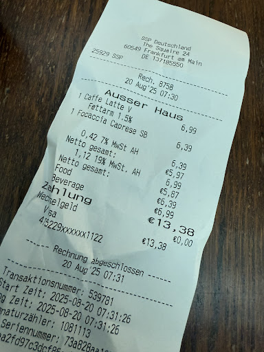 Read morethe worst starbucks I‘ve ever been (and I‘ve been to a lot). Employees do not have any clue about coffee. They are extremly rude and do not understand a single word (wether german or english) and the coffe is so disgusting. They made me the wrong coffee and after they finally understood which coffee I wanted, they gave me a really really disgusting one. I wanted my money back and at the end they gave me 6€ instead of 6,50€ back…if I was able to give 0 stars I would...