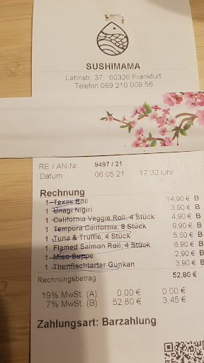 Your food is incredibly bad, some parts of sashimi I couldn’t eat, as they didn’t smell good already, sashimi pieces are small, awful quality and absolutely don’t worth the price you are charging. Nigiri are also having soooo thin fish pieces that you cannot get even in food court in any shopping mall. You are clearly overrated and I will share this reviews everywhere, as food that you are offering for this price is Absolutely Unacceptable! This was the worst experience of ordering sushi in Frankfurt so far for 2 years and especially considering the price of 64 EUR for 2 rolls, 1 rice, 2 portions of Nigiri and one sashimi for 18.90 EUR out of which I couldn’t eat even a half. Definitely don’t recommend to anyone and don’t buy their rating of 9.4 in Wolt -...