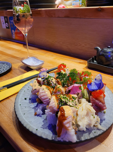 We ordered the Flying Salmon Roll, which was flambéed and full of rich, smoky flavor, and the Rainbow Roll, a beautifully arranged dish with various fresh fish toppings. The edible flowers, fresh herbs, and delicate garnishes added an artistic touch to the presentation, making the dish a feast for both the eyes and the palate. For dessert, we had crispy fried coconut rice balls, served with fresh berries and dusted with powdered sugar - really tasty. We also enjoyed a refreshing rose lemonade, served with berries and mint for a hint of sophistication.