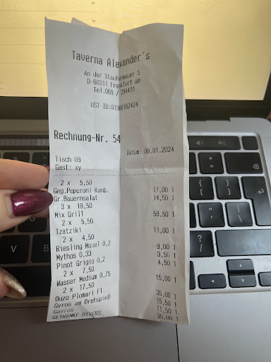 The four reasons for the 2 stars: Tsipouro and the price of the 0.2l bottle. We ordered Ouzo and Tsipouro. Ouzo Plomari 0.2L came at the price of €17.50. 3x the retail price (4-5€/bottle), not unusual for Frankfurt. When we asked for Tsipouro and if they have a bottle instead of 2cl (nothing else on the menu), the waiter told us yes of course and brought out Idoniko tsipouro. Without thinking we took the bottle. It was really partially our fault assuming it’s priced the same as the ouzo (although a quick informing from the waiter that the price is 35€ would have been nice). When we saw the bill for 35€/bottle, we asked why?! The response from the (I assume) owner was: “I get the bottle for €14,50 because it’s a special item coming from an island in Greece….”. We travel every year 1-2x to Greece (specifically islands), eat all the time in Greek restaurants all around Europe where we drink the same brands, buy these specific bottles for home and NEVER seen the 0.2 bottle for more than 8€ consumer retail (moves between €3,50 and €7,95 for regular consumers in Germany). Two possibilities: the owner has no real knowledge about the product pricing and the supplier makes a hefty profit, or he surcharges at least 7x of the purchase price of the good. The greek salad has such potential, but so disappointing. The tomatoes are slushy and have no flavour, tasted like cardboard. Now I understand it’s the middle of winter, but if consumers can get flavourful, ripe tomatoes, so can restaurants, especially for €14,50. Tzatziki and the portion. €4.50 for a tablespoon of tzatziki is way overpriced, compared to the fact that a huge portion of sardines with sides costs €11.50. No fully home made Dolmadakia. We were really sad about this, but not unusual for Germany.