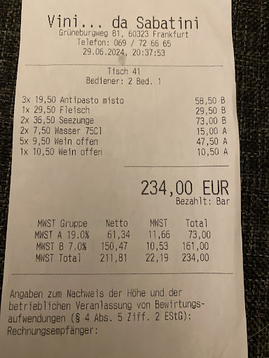 I would like to share my experience to warn other customers about this restaurant. Two friends and I went for dinner to this restaurant tonight. We initially thought the food was expensive for the quality, but the service was good so we just accepted the fact that we would over pay for average food. That was certainly not the issue. The issue was that we ordered an Antipasto Misto (19,50 euros) to SHARE as an appetizer. We got a big platter that we thought was expensive for what it was but, again, the full menu was over priced so we accepted it. What we were not expecting is that, in the end, we were charged 19,50 euros X 3 for the appetizer (1). Yes, almost 60 euros for a plate with three small pieces of mozzarella, 4 shrimps, 4 pieces of smoked salmon, and that was it. Nothing else, We specifically said we wanted to SHARE the appetizer. It was just the typical tactic to rip off the customer. It is too bad for them, because they made this sale, but they will never see us back as customers. We live in Frankfurt since many years and the bad reputation is worth much more than the little money they made on us tonight. The moral of the story: be VERY cautious at this place when you order. I am posting a copy of the invoice in case they dare trying to appeal to...