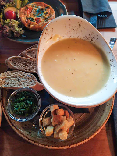 Read moreA great cafe to have a breakfast or just a warm meal. The potato soup was legendary! It's creamy and full of flavor! It is served with slices of freshly backed bread, croutons and chives. The quiche with spinach and tomatoes was fresh and tasted great, no overwhelming egg flavor. The panini with basil cream was crunchy and delicious. The prices are convenient, only the sweet pastries (you should see assortment) are...