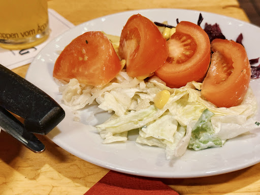 my girlfirend had the "pfefferfleisch" (a kind of goulash) with hashbrowns and a side salad. the meat was fatty, the sauce oily and reminded us of catfood. the hashbrowns were storebought (again) and the salad was made from the same canned items i had in mine. she payed 13 € for this. the goulash remained nearly uneaten.