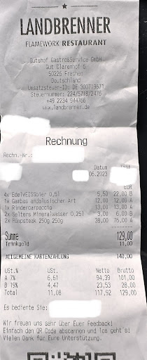 Read moreIch war heute mit Freunden im Landbrenners. Ich hatte das 300g Hüftsteak mit Pfifferlingen. Das Steak war so zäh, dass ich es nicht essen konnte und habe es mit einem freundlichen Gruß an die Küche zurückgehen lassen. Die Beilagen waren aber sehr fein. Erst nach Rückfrage was denn der Koch dazu zu sagen hätte, wurde mir mitgeteilt, dass es zur Kenntnis genommen wurde. Ich könne aber einen Kaffee aufs Haus bekommen, was ich abgelehnt habe. Beim bezahlen teilte mir die Bedienung mit, dass sie meinen Kaffee aus Kulanz trotzdem von der Rechnung genommen hat. Ich stellte klar, dass es mir nicht um den kostenlosen Kaffee oder ums Geld geht (daher meine Ablehnung einen Kaffee aufs Haus zu bekommen), sondern um die Tatsache, dass das Fleisch nicht essbar war und das Landbrenners doch sicher einen Qualitätsanspruch hat. Und wenn ein Gast das Gericht zurückgehen lässt es nicht um einen freien Kaffee geht. Die Bedienung entschuldigte sich, der Koch sei sehr beschäftigt und er sehe keinen Mangel bei der Zubereitung. Vielleicht war das Fleisch aber nicht gut. Also 35€ für zähes Fleisch? Nach dieser Aussage hätte das Gericht erst gar nicht berechnet werden sollen (das wurde aber nicht angeboten - gefordert habe ich es auch nicht, weil es nicht um Geld, sondern um den Anspruch des Landbrenners geht wie mit so einem Fall umgegangen wird). Da ich eh schon bezahlt habe, habe ich es darauf beruhen lassen.