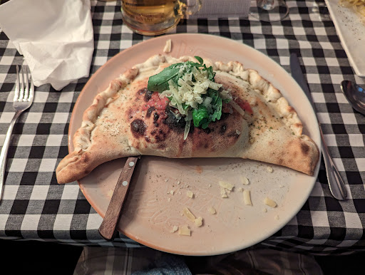 Die vielen guten Bewertungen kann ich leider nicht nachvollziehen. Es ist innen recht gemütlich eingerichteten und auch alles sauber. Auch die Bedingung ist, zumindest teilweise, freundlich. Aber aufmerksam ist sie definitiv nicht. Uns wurde von einem freundlichen Kellner ein Tisch angeboten und die Karte gebracht. Gefühlte zwei Minuten später stand eine deutlich weniger freundliche Kellnerin mit dem Zettel parat und wollte die Bestellung aufnehmen. Wir bestellten Getränke und baten um eine Minute Bedenkzeit um das Essen auszuwählen. Kurze Zeit später brachte uns eine weitere, aber diesmal wirklich nette Kellnerin die Getränke und verschwand umgehend wieder. Wir hatten uns zwischenzeitlich entschieden und legten demonstrativ die Karten zur Seite. Währenddessen standen nun alle drei Kellner:innen am Eingang und quatschten. Kurze Zeit später wurde das Gespräch dann nach innen verlegt. Hier hätte man gehen sollen. Aber Chance verpasst...🤦🏻♂️ Als sie wieder raus kamen, gelang es mir dann irgendwann doch, die Aufmerksamkeit unserer Kellnerin zu erregen und die Bestellung aufzugeben. Aber besser wurde es dann auch nicht. Es fängt für mich schon mit dem in die Servietten eingeknüllten Besteck an. Das mag seinen praktischen Grund haben, aber sieht unmöglich aus. Das Brot und die Oliven, die vorher serviert werden, schmecken so, als ob sie vorher schon an ein paar anderen Tischen gestanden hätten. Hier sollte man als italienisches Restaurant wirklich einen anderen Anspruch haben. Der erste Eindruck zählt! Und hier war für mich der Abend leider schon gelaufen. Apropos erster Eindruck - das Essen kam dann tatsächlich recht schnell: Kleine Portion auf riesigem Teller, angerichtet wie in den Neunzigern und wird vermutlich auch seit dem schon so gemacht. 🥱 Ich hab's nicht fotografiert, aber schaut euch die anderen Bilder an. Geschmacklich war mein Essen okay, aber bestenfalls Mittelmaß. Die Cannelloni von meiner Freundin fand ich in jeder Hinsicht eine Katastrophe. Als ich mein Essen gegessen hatte, kam die freundliche Kellnerin, die zuvor den Wein gebracht hatte, und räumte meinen Teller ab - während meine Freundin noch isst! Geht gar nicht! Aber es fasst den Gesamteindruck doch ziemlich gut zusammen: Man verlangt den vollen Preis, aber bietet höchstens Mittelmaß. Der Schnaps/Espresso zum Abschied ist nett, aber reißt es leider auch nicht mehr...