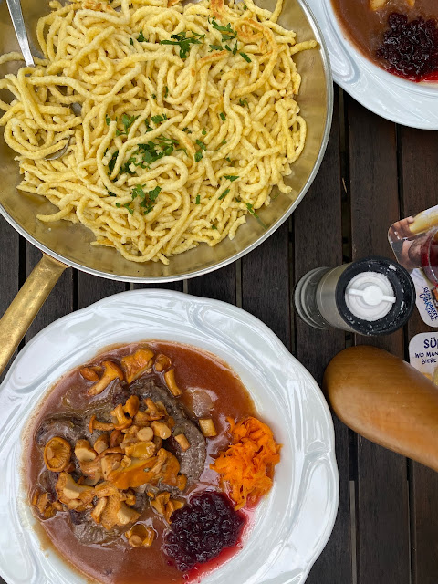 Read moreWir haben im Hinterhof gesessen und fanden es sehr urig und gemütlich. Es gab für uns Wildschweinsteak mit Spätzle, Pfifferlingsoße und Preiselbeeren. Dazu zwei Saftschorlen. Das Essen kam relativ zügig (etwa 20 Minuten, wir waren allerdings zumindest draußen die einzigen Gäste). Es hat uns wahnsinnig gut geschmeckt! Das Steak war etwas zäh, jedoch haben mich die super leckeren Spätzle und die Soße dazu komplett umgehauen. Für 55€ insgesamt preislich absolut in Ordnung. Der Wirt war sehr sympathisch und freundlich! Um uns herum wurde Karten unter älteren Leuten gespielt, die Familie des Wirts saß an einem anderen Tisch und hat sich absolut rührend um mich gekümmert, als ich von einer Wespe gestochen wurde. Die Stimmung war sehr familiär, wir haben uns total wohl gefühlt. Vielen lieben Dank, kommen...