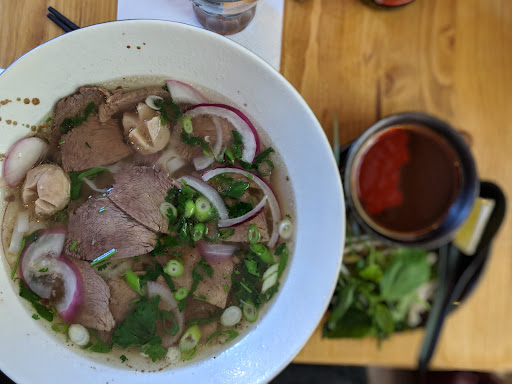 I came here for the first time this week with a bunch of colleagues during lunch. It's a bit out of the way for me but since I learned that it opened it's doors I wanted to check it out. I went off lunch menu knowing I can't pop by here every other day and got myself a pho bo and some spring rolls to start with. The spring rolls were piping hot crispy delicious with some lettuce to wrap them in and this sweet and sticky dipping sauce. Tastewise top, just a bit pricey (4,20,-EUR) for two small springrolls I reckon (to be fair though it says "two" on the menu). The pho bo was great, tasty cinammony broth, lean slices of brisket and those sausage meatball pits were good too. There were a little less fresh herbs aside than I wished for but hey, there were actual fresh herbs. :) Also here, the portion wasn't massive, but really tasty stuff so who cares. Service was friendly but maybe (hopefully) due to lunch hour fairly slow and a bit chaotic. Things got forgotten multiple times and others disappeared from the table way too early. I'll be back for their flying noodle bun eventually and maybe service also has found it's way til then. Thanks and...