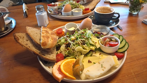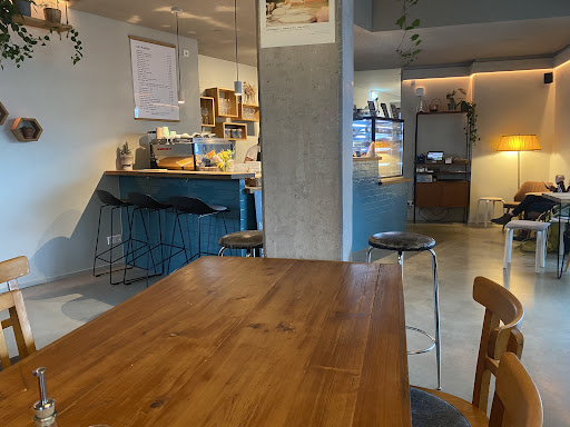 Die Atmosphäre im Café ist sehr angenehmen. Die Einrichtung ist total schön und stimmig. Es ist modern, aber nicht "kühl". Durch die Grüntöne und Blümchen auf den Tischen wirkt es sehr gemütlich. Es war sowohl drinnen als auch draußen (obwohl es sehr regnerisch war) voll. Es kamen immer wieder Gäste rein, die erfolglos nach einem Platz geschaut haben. Daher empfehle ich eine Reservierung. Es gab mehrere Kuchen zur Auswahl, unter anderem auch vegane Varianten. Bei den meisten Kuchen hat ein Stück um die 4€ gekostet. Wir hatten einen Zitronenkuchen und einen Pistazien-Limetten-Kuchen. Beides hat gut geschmeckt. Es hat sich jedoch interessanter gelesen. :) Ich fand die Kuchen vergleichsweise teurer. Ich kenne es eher, dass beim Bäcker oder der Konditorei Tortenstücke ca. 4 Euro kosten. Hier hat jeweils ein Stück von unseren ausgesuchten Kuchen ca. 4,30€ gekostet. Dabei waren es eher 'kleinere' Stücke, eher wie ein Stück von einem Kasten-Marmorkuchen. Ich kann mir aber auch gut vorstellen, dass die veganen Zutaten etwas kostspieliger sind. Dazu haben wir Cappuccino getrunken, die richtig gut waren. Das Personal war sehr nett. Vor allem die Bedienung, die immer ein sehr herzliches Lächeln im Gesicht hatte. Wir hätten sie nur gerne öfters gesehen :) wir waren ca. 1h dort und wir haben sie nur zwei Mal gesehen - als die Bestellung aufgenommen und uns gebracht wurde. Danach kam niemand mehr. Wie gesagt war das Café sowohl drinnen, als auch draußen voll, aber ich denke, der ein oder andere hätte nochmal etwas bestellen wollen.
