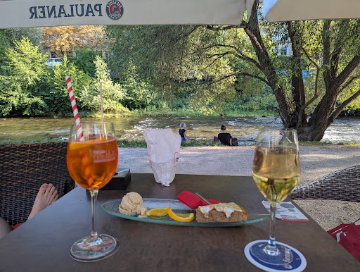 Aber: Sorry, wenn es NULL Punkte gäbe, würde ich sie gern ziehen! Wir waren am Pfingstmontag zwischen 15 und 17.30 Uhr im Laden und haben einen Missstand nach dem Anderen beobachtet. Als wir ankamen war der Laden recht voll, Wetter toll und der Laden sieht einladend aus. Das Personal, augenscheinlich Schüler und Studenten, war durchaus engagiert aber sehr, sehr schlecht geführt und gebrieft. Nach ca. 20 min wurde unser Tisch von den "Altlasten" der Vorgänger "befreit" und wir bestellten. Die Lieferung ging recht schnell von statten. Wir hatten einen Liter Rosewein, eine Schorle und Eiswürfel bestellt. Der Wein war jetzt kein Highlight aber immerhin auf Eis gekühlt. Die beiden Gläser, einmal ein Rotweinglas, zum Anderen ein Weißweinglas waren nicht gespült und voller Reste der Vorbesitzer. Nach der Reklamtion kamen die Gläser zurück, allerdings unpoliert und nach wie vor mit Lippenstiftresten. Die Schorle bzw. deren Behälter (Glas) im gleichen Outfit und dadurch nicht akzeptabel. Nach der Rückgabe hatte die Crew 1,5 Stunden Zeit ein neues Getränk zu bringen, was aber nicht passierte - muss wahrscheinlich nicht erwähnen, dass das Getränk trotzdem auf der Rechnung stand und wir es vom Preis abziehen mußten. Ganz zum Anfang unseres Besuches passierte den Kellnern ein Malheur, zwei volle Gläser fielen vom Tablett (inmitten des Hauptganges für Kunden und Personal), bis zum Ende unseres Besuches wurde nicht beräumt. Mit Blick auf die Dreisam rechts stehen die Tische und Stühle so dicht, dass das Personal mit vollen Tabletts über eine Lücke im Boden von 2 x 0.5 Metern balancieren muss! (Hier sollte die Bauaufsicht aktiv werden!!!). In der Folge wurden Gäste nicht oder nur sporadisch bedient. Ein Beispiel: zwei Damen neben uns bestellen einen Eiskaffe und einen Eisbecher. Nach 10 min kam der Eiskaffe, das Eis ließ auf sich warten. Auf Nachfrage sagte der Kellner, dass der Kaffe an der Bar und das Eis in der Küche produziert würde - Küche wäre überlastet - Eis folgt. Nach weiteren 20 min zahlte die Damen, ohne das Eis bekommen zu haben. Unten am Fleiß saßen 6 Menschen, welche nicht bedient wurden. Ich möchte mich an dieser Stelle nicht zum augenscheinlichen Grund äußern. Zwei Stunden und ich könnte diese Aufzählung noch beliebig ergänzen. Ich möchte betonen, dass das Personal aus Studies und Schülern (leider auch, durch Malheure verursacht, schmutzige Dienstkleidung tragend )nichts für die katastrophale Präsentation diese Ladens kann. Hier scheint der/ die Franchisenehmer/in komplett zu versagen und der Franchisegeber alle, aber auch wirklich alle Auge zu verschließen.