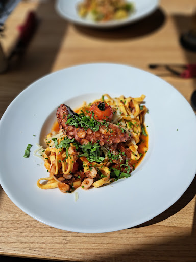 Was war das denn? Ohne Vorahnung kamen wir hier ins Industriegebiet Haid. Schon der Eintritt ist beeindruckend. Eine sehr hohe Vorraum des Gebäudes ist mit Glas bedeckt und bildet einen Wintergarten. Hier stehen exotische Riesenbäume im Gebäude. Wir werden freundlich begrüßt und erhalten die Speisekarte. Zusätzlich gibt es noch eine Tageskarte. ALLES sieht super lecker aus. Ich teste gerne das Personal und lass mich beraten. Auch diese junge Dame weiß Bescheid. Der Pulpo ist Wildfang und soll super zart. Ehrlich gesagt bin ich immer ein bisschen skeptisch bei Pulpo. Aber dieser Koch hatte drauf. Große Portion, viel Pulpo (Scheibchen + den Arm). Das Hähnchen-Curry meines Kollegen sieht auch klasse aus. Saftige Fleischstückchen und leckere Soße...Wir...