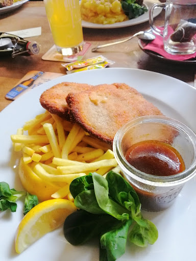 I do not know why give 5 stars, because the fan of the nearby transformation box was too loud, the waitress forgot me a few times with the wine and I finally missed to pee into a tuba. Therefore I try to analyse, why the heck I give 5 stars. The "restaurant" Goldener Sternen is located at the edge of a cosy little place in the middle of a residential area. They actually don't want to be a restaurant, rather a german "Wirtshaus" which could be translated with a kind of better tavern. But let us jump right in: I was sitting there next to the loud fan of the transformation box, waiting for the french red wine I ordered and finally I got it. With it came the most honest "Sorry" I have ever received. Obvisiouly the waitress was alone and pretty busy serving a whole restaurant. I think that's when I started feeling right at this place. Next to my table there sat an old aged couple. "I bet they are capable of feeling the breeze from the fan" thought I while taking a sip of my wine. The wine was cooled down due to the high temperature outside. "Delicious" that's what I thought when the odour reached the receptors of my nose. Magic happened as I was now ready to choose my meal. Was I? Rather not. I dangeled between something seasonal and something classical. There must be higher force, because right in this moment a new odour filled my nose which let me screen through the menu like Samson from Chip and Chap: Muenster. Here it was the "Goldener Sternen" Cordon Bleu filled with this original cheese. Not for everyone, but perfect for me. I wondered why the waitor grinned while he served my dish, but I bet he knew I will have to write a review after tasting their best. Delicious! Simple, but simply delicious! I closed my visit with a cut-up and sugared pancake with(out) raisins called "Kaiserschmarrn" and left the place with a big...