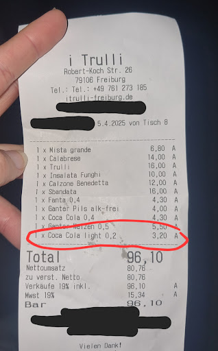 Schon beim ersten Blick auf die Getränkekarte ist mir ein ziemlicher Widerspruch aufgefallen: Eine Coca Cola ist mit 0,3l für 3,20 € ausgeschrieben – serviert wurden mir aber nur 0,2l für den gleichen Preis. Das ist kein Versehen mehr, sondern schlichtweg frech.