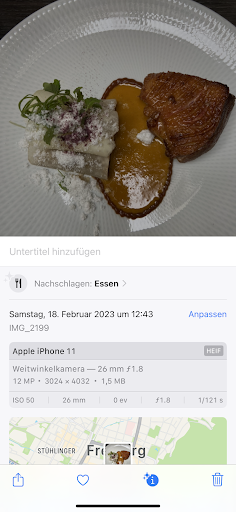 Glücklicherweise hat die Smartphone-Allgegenwärtigkeit auch Vorteile: So kann ich lückenlos anhand der Zeitstempel und GPS-Tags der Bilder auf meinem Handy dokumentieren, dass die Bewirtung am Samstag, den 18.02.2023 stattgefunden hat. Die Suppen wurden gegen 12:19 Uhr serviert. Ente und Wirsing folgten gegen 12:42 Uhr. Ich stelle ein paar Bilder hier ein. Dort ist auch ein Teil des leeren Restaurants zu unserem Besuchsbeginn sowie der nahestehende Nachbarstisch, der jegliche Privatsphäre verhindert hat, zu sehen.