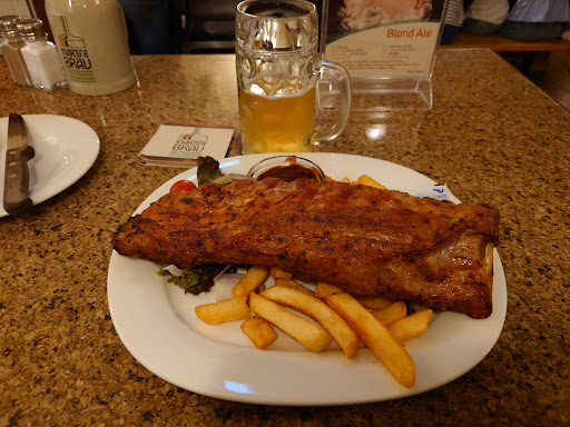 I spent a few days in Freigburg, and it was very lovely overall. I stumbled upon this restaurant as a recommendation from the local guitar shop owner, and so I came back for dinner two out of the four days, because despite a not so pleasant (rude) small interaction with a waitress on the first day, I managed to get in and was received by one of the most charismatic, kind, friendly and attentive waiters I have ever come across. I didn't get his name, but I know he speaks many languages and I complimented his service quality, and the second day he even called me 'maestro' which, yes, even though it might be used as a general term for addressing people, it's very flattering for a Spanish speaker. Anyway, he recommended the schnitzel (breaded pork chop) the first night, and it was to die for, and accompanied with the house beer, on a very hot day and after a day of physical activities, I was in heaven. The second day another excellent waiter served me and recommended the ribs, and so I ordered it along with, of course, more house beer. As a dessert I ordered the forest cake, and though not to my taste, I appreciated the craft and flavours behind it. Overall 5 stars, but I give 4 stars for service, for that one rude interaction, as for the people who took my food order both days were excellent. The ambience is very pleasant and very interesting, as they have two big tanks on display, where I assume the beer is brewed. The menu caters for meat and non-near eaters, and it's available in English. I discovered that generally the queue that forms outside the restaurant is for people wanting to sit outside, obviously in hot days/season, so you can skip it by requesting to sit downstairs where there was plenty of tables available on both days....