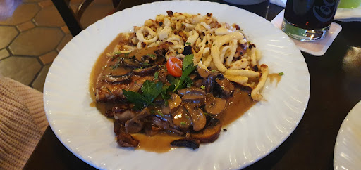 Ursprünglich hatte ich ein Steak essen wollen, traute mich aber angesichts des heruntergewirtschafteten Ambientes nicht, sondern wählte lieber etwas, bei dem man nicht so viel falsch machen kann: Käsespätzle mit Schinken. Die waren aber sehr gut – vielleicht ein bisschen salzig.