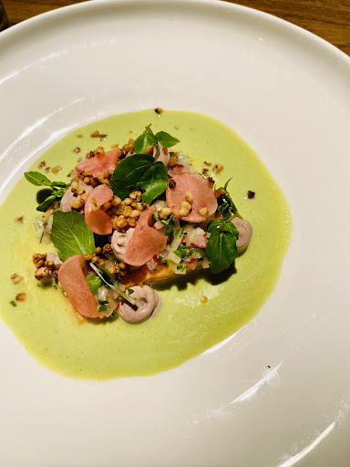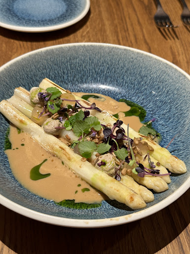 Betreiber und Küchenchef Amadeus Kura und sein Team leisten tolle Arbeit. Das Essen ist modern, mit ausgefeilten Aromen, basiert auf regionalen Produkten und hat einen asiatischen und orientalischen Einschlag. Alles passt super zusammen, schmeckt hervorragend, leicht, zeitgemäß und macht viele Freude. Wir hatten das Glück, am Ende der Spargelsaison zu Gast zu sein. Als Vorspeise hatten wir etwa Spargel | Miso | Sonnenblumenkerne, die weißen Spargel waren leicht angegrillt und perfekt al dente, die Miso-Creme/-Hollandaise mit viel Umami und die Sonnenblumenkerne ergänzten ein knackiges, nussiges Aroma, super gelungen. Dazu das Focaccia vom Brotbruder, dem überaus gelobten und kultigen Freiburger Bäcker aus dem Stadtteil Wiehre. Als Hauptspeise hatten wir u. a. Entrecôte Deckel | Dal | Grüne Bohne | Nduja, das Rindfleisch war auf den Punkt gegart, das Dal stellte sich als raffiniertes Linsenpüree heraus, die italienische 'Nduja-Wurst wurde in gerösteter Form als scharfe Komponente genutzt, alles zusammen sehr aromatisch und überaus gelungen. Sehr schön auch der Seesaibling mit warmem (!) Couscous und Yuzu, ein leichtes, armomatisches und sehr harmonisches Gericht. Zum Dessert gab es Erdbeere | Hollunder | Joghurt, ein frisches, fruchtiges, leichtes, jahrezeitliches Dessert, das unser Essen perfekt abschloss. Alles in allem ein wunderbares und sehr gelungenes Abendessen.