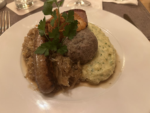 Die Wahl fiel auf den „Himmelreich Teller“, eine köstliche Kombination aus Leberknödel, Würstchen und Saumagen, begleitet von feinem Kartoffelpüree und aromatischem Sauerkraut. Als das Gericht serviert wurde, überzeugte es nicht nur optisch, sondern auch geschmacklich auf ganzer Linie: Perfekte Zubereitung, erstklassige Zutaten und eine herausragende Würzung machten jeden Bissen zu einem Genuss.