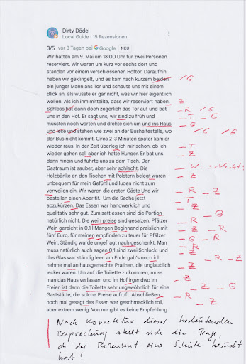 Warum könnt ihr frustrierten Schreiberlinge euren Frust nicht einfach in der Muckibude abtrainieren, statt Leute die sich den ganzen Tag UND Nacht den A…. für uns Gäste aufreißen mit eurem frustrierten Wichtigtuergesülze schlecht zu machen? Im Anhang hat ein guter Freund und Gerngutessengeher mal professionell die Ergüsse von Dirty D. korrigiert. Mehr gibt es nicht...