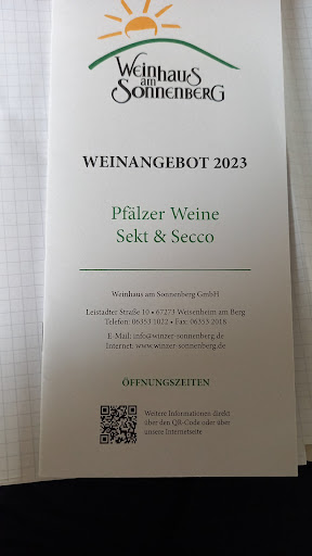 Read moreDas Weinhaus am Sonnenberg gehört zu meinen regelmäßigen Ausflugszielen in der Pfalz, wegen der guten, schönen Lage, den ehrlichen Weinen (sehr gut: die Rotweine auf der Basis von traditionellen französischen Rebsorten) und auch die Bandbreite an Weißweinen vom klassischen Riesling bis zu aktuellen Kreationen)und der freundlichen, familiären Bedienung und dem guten Service. Ein Besuch, der sich immer lohnt und Kleinigkeiten zum Essen und Verkosten gibt es immer. Auf Wiedersehen am...