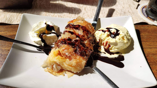 One of my favourite places in the city. Accessible from the centrum by a short walk, has a nice mood to it. The staff are friendly, even when by mistake we went in 40 minutes before closing (sorry again, we didn't notice) they welcomed us, even though we said we'd come back after the reopening. The food is superb, when you say authentical greek food then I think of Delphi. I strongly recommend their mixed plates, first you get a big, tasty salad appetiser, then the actual food, which consists of different kind of meats (souvlaki is just sooo goood), allowing you to taste more than one unique greek meal for one price (and one belly). The portions are big, god bless whoever can eat all of it and even a dessert, because it's nearly impossible. The desserts are also super, this one on the picture is my favourite so far. The prices are absolutely good for such big...