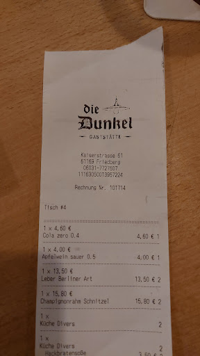 Read moreSpontan gestern hatte sich ein Freund angemeldet um sich zu treffen. Die Mitte zwischen uns ist circa Friedberg. Keiner kennt sich gut aus, also google an und auf der Kaiserstrasse etwas gesucht. Die Dunkel klang "merkwürdig" und hat mich verlockt einen Tisch für 2 um 1900 zu buchen. Es hat sich gelohnt. Sehr unaufdringlich aber höchst aufmerksamer Service, gutes Essen und warmes Ambiente. Einzige Kritik die nicht selbsttätig schließende Tür durch die eiskalter Wind reinkam. Ich hatte ja versprochen einen Hinweis zu senden, wie man das vermeiden kann. Ich baue euch das auch kostenfrei ein, wenn ihr es kauft Burg Wächter Türschließer 504. Gibt's...