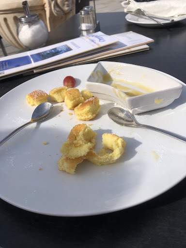 Read moreVon mir gibt es hier definitiv keine Empfehlung. Tischreservierung: Als wir ankamen, sagte der Kellner: " Ach ja, Sie haben um Schatten reserviert!" Er suchte über seine Terrasse und platzierte uns in der prallen Sonne, da keine Tischreservierung erfolgt und kein Platz im Schatten frei war. Auf Nachfrage erklärte er, die Sonne sei da auch irgendwann weg ...Richtig! 2 Std. später nach Sonnenuntergang! Auf zweimalige Nachfrage und Bitte um einen Schattenplatz bekamen wir den miesesten Tisch ganz hinten mit Blick in eine hässliche große Betonnecke, in der Tische mit Aschenbecherstapeln lagerten und auf der anderen Seite eine Betontreppe und ein Notausgang des angrenzenden Saales zu sehen waren. Durch fas Zusammenstellen zweier kleinerer Tische hätte man ebenfalls einen größeren Tisch im Schatten in besserer Lage bereitstellen können. Man war aber offensichtlich nicht bereit, unserer Anfrage diesbezüglich nachzukommen. Da wir mit älteren Senioren unterwegs waren, haben wir zähneknirschend den miesen Ausblick in schöner Lage akzeptiert, da es ca. 33 Grad waren und die Senioren dringend Schatten brauchten.