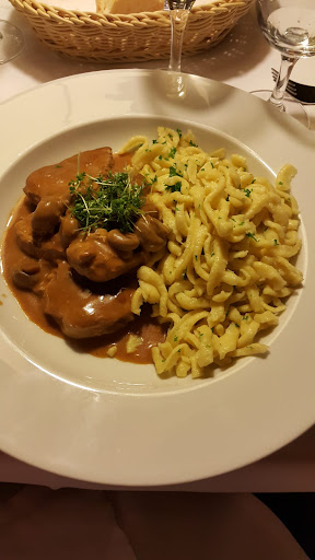 Leider änderte sich dies jedoch mit steigender Gästezahl. Immer längere Pausen. Selten war der Service zu sehen. Obwohl der Kellner uns informierte das dass essen etwa 20 Minuten dauern würde, waren es am Ende 40 Minuten. Trotz Vorspeise kam das Hauptgericht sehr spät. Da wir an diesem Abend um 20 Uhr jedoch im anliegenden Festsaal einen Auftritt von Gerd Dudenhöffer sehen wollten, wurde die Zeit leider sehr eng. Das Hauptgericht kam kurz nach 19 Uhr als bereits an den Nachbartischen alles erledigt war.