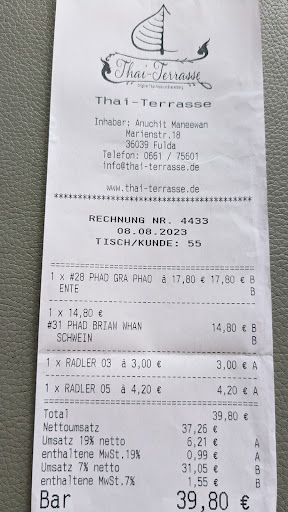 Read moreVor kurzem waren wir zum ersten Mal die Thai-Terrasse in FD testen, nachdem die anderen Thai-Restaurants vor Ort uns schon weitesgehend bekannt sind. Tisch-Reservierung für 6 Personen wurde einige Tage zuvor gemacht und penibel genau inkl. gewünschter Tischnummer eingehalten, erster Pluspunkt. Unsere hübsche Bedienung war jederzeit auf Zack und mit thailändischer Freundlichkeit am Werk. Ein bestelltes Weizen kam handwarm an den Tisch, vermutlich wurde gerade der Kühlschrank aufgefüllt, kurzer Hinweis und es wurde ausgetauscht - so soll es sein! Die Speisen waren lecker und von guter Qualität, wir hatten u.a. Pad Thai, Pad Si-Ew, Som Tam (in Corona-Zeiten nur schwer und teuer zu bekommen, hier aber vorhanden!), Rotes Curry (als einziges leider etwas wässrig/lasch) und es wurde sogar auf einen Extra-Wunsch außerhalb der Karte gerne eingegangen (Gai Pad Med Mamuang) - sehr gut und flexibel! Nachtisch gebackene Banane ebenfalls lecker. Man sitzt sehr schön auf der Terrasse mit Blick auf die Tennisplätze und die Umgebung des Frauenbergs, dazu schöner Sonnenuntergang. Zahlen kann man dann auf Wunsch auch per Karte, wie es heutzutage der Standard sein sollte. Das Preisniveau ist für FD etwas gehobener - vermutlich aufgrund der Lage - aber auch nicht überteuert. Wären die einfacheren Gerichte wie gebratener Reis mit Huhn (12,80€) etwas preiswerter, könnte man das auch mal mittags oder zum Mitnehmen bestellen. Ansonsten kommen wir auch so natürlich gerne mal wieder wenn uns die Thai-Küche fehlt... Liebe Grüße an das Team, macht weiter so, wir hatten dank euch einen...