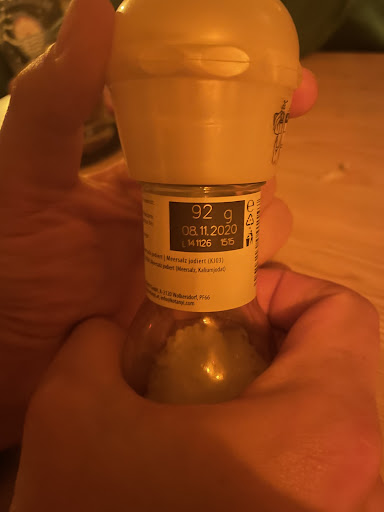 „Selbstgemachte Pizza“ aus fertig Produkten. Champignonpizza mit Zwiebeln. Wurde aufgegessen, damit es nicht im Müll landet. Die Spezialität Dampfboot ist ein schlabbriges Ketchup Käse Schinken Brot in Alufolie. Das beste am Gericht war das Salz, das ich nachbestellt habe, siehe Anhang: Ist auch schon seid 2,5 Jahren abgelaufen.