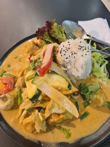 Given the circumstance, the food was fine. Duck w cocosause vegetables and rice. Bird was crispy and juicy and the vegetables cooked al dente as supposed to be. With a beer 10,5 Euro is a very fair price. My mate had noodles with fired vegetables and chicken and his serving was also tasty and very large. Maybe 3,5 would be the...