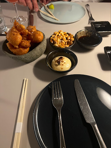 Read moreVorneweg: das Restaurant ist wirklich cool und wir haben uns dort sehr wohl gefühlt. Das Konzept, dass alle Speisen kommunal serviert werden, die offene Küche sowie da gediegene Ambiente sind super. Leider war das Essen größtenteils eine herbe Enttäuschung. Zu zweit haben wir vier "Vorspeisen" und ein großes bone-in Ribeye Steak bestellt. Die Calamari im Tempurateig für €12 waren zähe, geschmacklosen frittierte Ringe mit scharfer Mayonnaise. Hätte ich sie blind verkostet, ich hätte auf Tiefkühlware getippt. Die Ceviche Mixto für € 16 waren undefinierbar klein geschnittene Meeresfrüchte in pappkartonartigen, geschmacklosen Tacos - auch kein Hit. Die Spicy Tuna Sushivariation für € 13 war ganz gut - kleibgeschnittener Tunfisch auf knusprig frittiertem Reis. Die Pescado Mixto Makirolle für € 19 war auch gut. Das Steak, das uns extra als im eigenen Hause trockengereift und als qualitativ super hochwertig von der Kellnerin angepriesen wurde und für 1000g immerhin € 90 ohne Beilagen kostet, war allerdings eine wahnsinnige Enttäuschung. Schon während der Zubereitung sah ich Dank der offenen Küche, dass das Steak einfach minutenlang in direkter Flamme lag, was unweigerlich zu einem verbrannten Steak führt. Der Koch kratzte sogar verbranntes schwarzes vor meinen Augen von unserem Steak. Als es serviert wurde kam gleich ein Kellner und entschuldigte, dass dem Küchenleiter beim Aufschneiden auffiel dass das Steak äußerst fettig und von schlechterer Qualität ist. Sie würden daher den Preis um 50% reduzieren. Seltsam, wenn mir als Koch so etwas auffiele würde ich auf jeden Fall ein neues Steak zubereiten. Natürlich war es auch außen komplett schwarz und noch dazu ziemlich zäh. Nachdem wir das den Kellnern auch noch mitteilen wurde der Preis weiter reduziert, ich hätte aber lieber viel gezahlt und dafür ein geiles Steak gegessen! Die offene Küche hat zudem den Nachteil, dass man genau siehst dass z.B. die Süßkartoffelpommes aus einer Tiefkühlpackung kommen. Fazit: ein schönes Restaurant und Sushi kann man dort durchaus essen. Von allem anderen würde ich die Finger lassen. Die Preise sind, selbst wenn man bedenkt dass es ein Hotelrestaurant ist, einfach nicht angemessen. Hingehen werde ich wahrscheinlich...