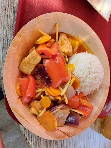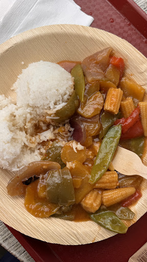 Das rote Gemüse Curry hier basiert auf mit Curry Pulver angerührter Stärke. Gemüse ist hier hauptsächlich Baby Mais, rote Zwiebeln und Paprika. Als Zugabe sind gelbe Karotten in dünnen Scheiben dabei. Ich wollte eigentlich nur ein gesünderes, leichteres Essen, leider ist mir davon dann etwas schlecht geworden. Überdachtes Sitzen ist nicht möglich. Die Frühlingsrollen sind in Ordnung.