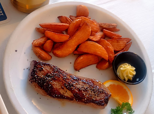Read moreRead moreWenn man sich den ganzen Tag schon Bratkartoffeln zum Steak einbildet...! Sich darauf freut, weil sie in der Speisekarte aufgeführt sind und die Bedienung sagt:" Haben wir heute nicht, weil so viel los ist!" Da ist der Abend für mich schon gelaufen! Mise en place (Bereitstellung und Vorbereitung eines Arbeitsplatzes um einen leichteren Ablauf zu gewähren) ist das A&O! Für mich in diesem Fall absolut unverständlich! Fertigprodukte wie Pommes, Steak-House-Fritten und Wedges ist halt nicht mein Favorit! Salatdressing viel zu Essig lastig! Gemischter Salat lieblos, bestehend aus hauptsächlich Blattsalaten, geraspelte Karotten, 2 Tomatenecken, eine Gurkenscheibe, die sich irgendwie verirrt hat! Der saure Essig-Öl-Dressing einfach nur oben drauf geschüttet wird! Schade! Könnte man besser lösen! Ofenkartoffel mit dem Sauerrahm für meinen Geschmack mit viel zu viel Knoblauch gespickt. Rib Eye war perfekt gebraten gute Qualität. Die Weinkarte ist für ein Steakhouse nicht passend. Eine Weinbegleitung, die in Frage kommen könnte, ist leider in weiter Ferne! Qualitativ hochwertige Rotweine & Weissweine aus Frankreich & Italien sowie deutsche Winzerweine...