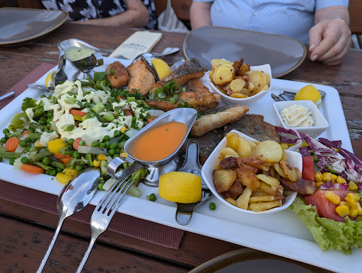 Very individual, almost unique building in which excellent fish dishes are served in a rustic atmosphere. Real soft sheepskins lie on the wooden benches and chairs and invite you to sit comfortably. A place for very good food and relaxation. In summer there is an outdoor terrace and a place by the carp pond. The carp are fed and the water is churned up by hundreds of the magnificent animals. There are also meals without fish and something for vegetarians.