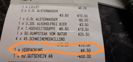 Read moreWir sind am 31.08.2025 mit 5 Personen dort zum Mittag gewesen. Es wurde uns gleich gesagt, daß es etwas länger dauern kann mit dem Essen, da man im oberen Teil der Gaststätte eine große Gesellschaft hatte. Alles gut, wir hatten es ja nicht eilig. Essen kam dann doch schnell und war auch gut, wie bisher jedesmal. Aber zu Hause dann der Blick auf die Rechnung: 4,50 Euro für das Verpacken der beiden kleinen Fleischstücke, die meine Mutter nicht geschafft hat und wir einpacken lassen haben. Ist das euer Ernst ??? Und es wurde nicht mit einem Wort erwähnt, daß das Einpacken extra berechnet wird, ansonsten hätte ich gesagt, dann gebt es halt den Schweinen. Die Verpackung bestand auch nur aus einer kleinen Pappe die mit Alufolie umwickelt war, also kann man diesen Preis auch nicht mit der teuren Verpackung begründen. Aus diesem Grund raten wir jedem, der dort essen gehen möchte, lieber alles aufzuessen und nichts einpacken zu lassen. Somit war das unser letzter Besuch und es wird unsererseits auch keine...